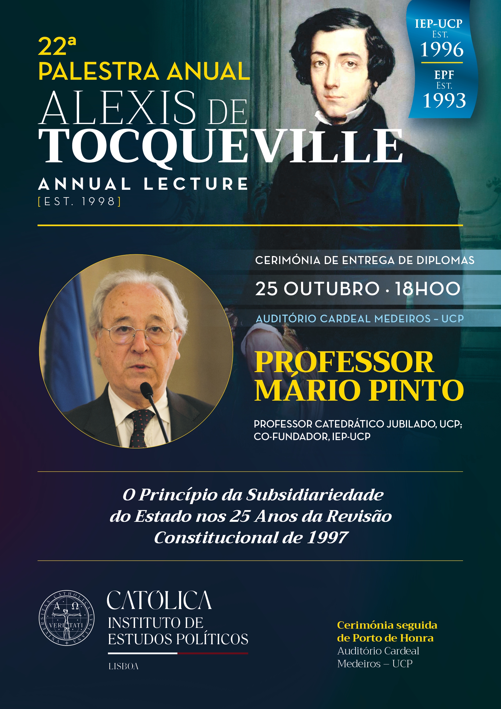 The name Alexis de Tocqueville may not be widely known, but it was -and continues to be- a name that expresses with particular elegance and distinction the project dreamt by IEP-UCP: a project of university autonomy, of orderly and quiet defense of freedom, of refusal of what Tocqueville called a "sterile conflict between Old Regime and Revolution" or "perpetual oscillation between serfdom and abuse".