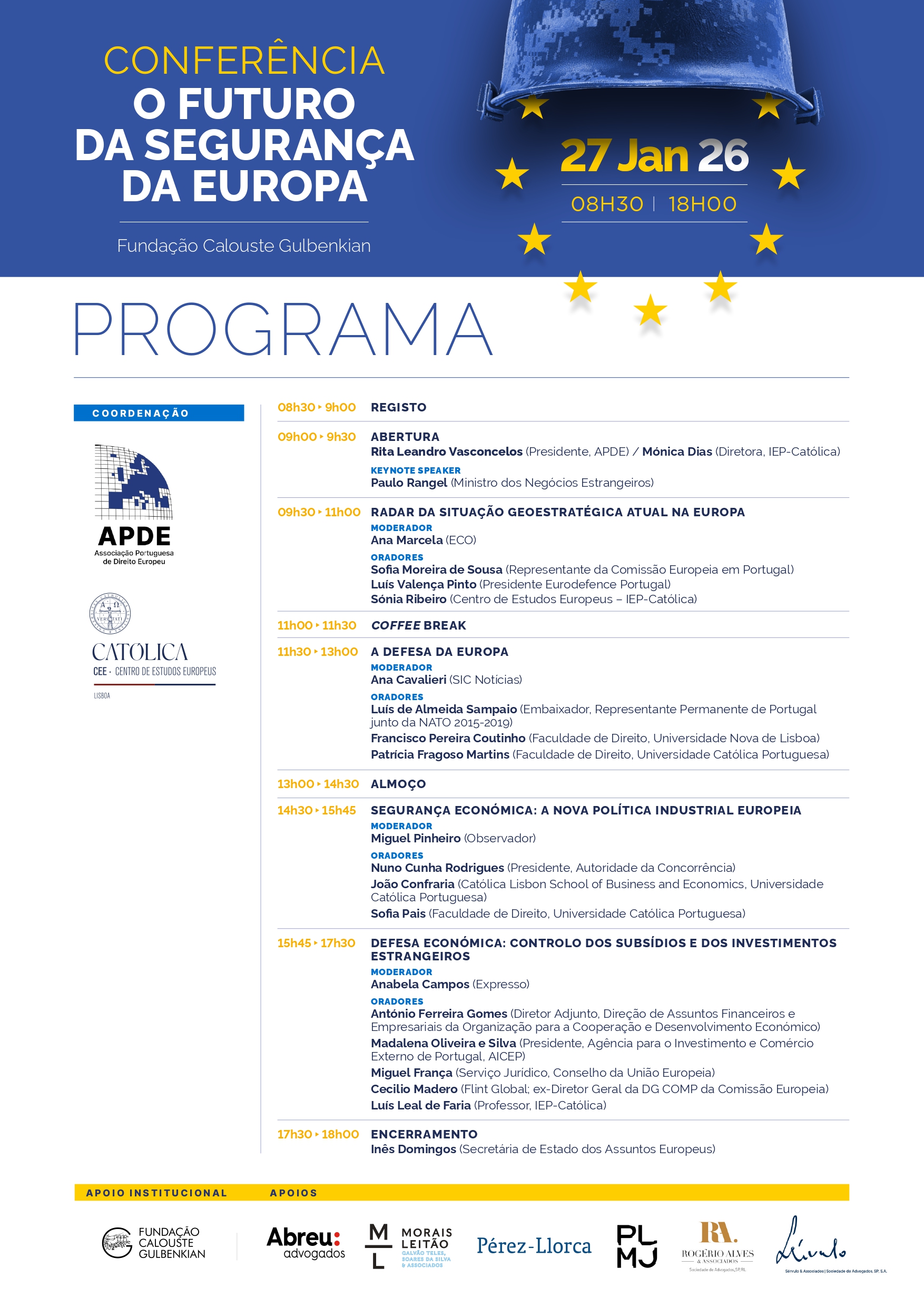 A Conferência “O Futuro da Segurança da Europa”, coorganizada pela Associação Portuguesa de Direito Europeu (APDE) e pelo Centro de Estudos Europeus do Instituto de Estudos Políticos da Universidade Católica Portuguesa terá lugar na Gulbenkian, dia 27 de janeiro.